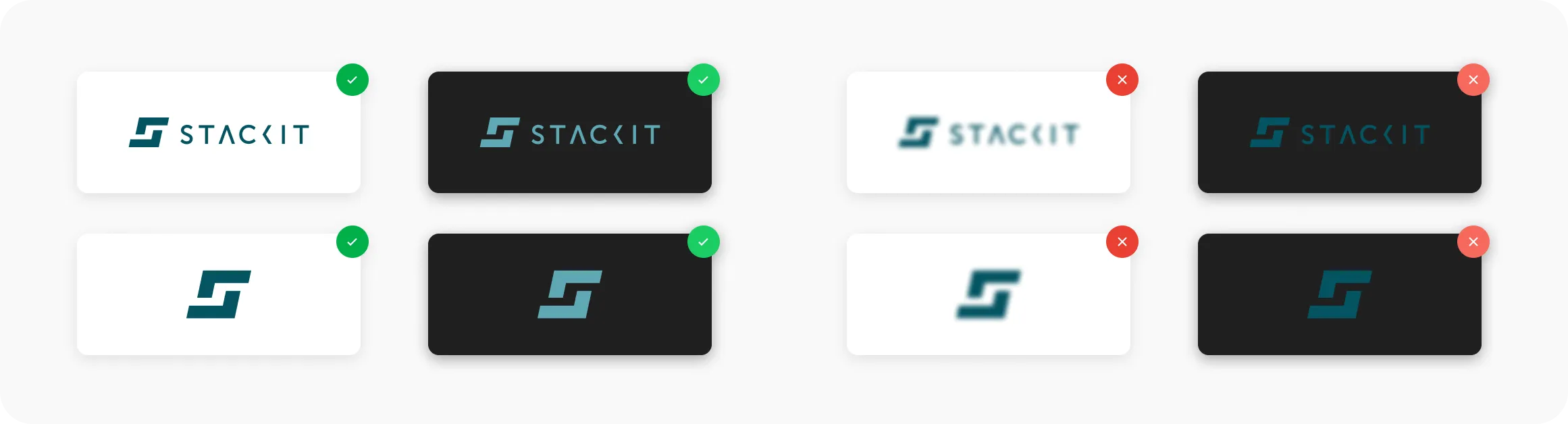 left - logos are clearly visible in all variants and designs, right - logos in low resolution or without high contrast are not clearly visible.
