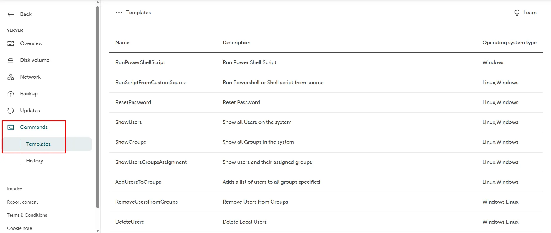 The following documentation describes how you can retrieve all currently available and supported command templates in the STACKIT Portal in order to use them for remote execution on your server.