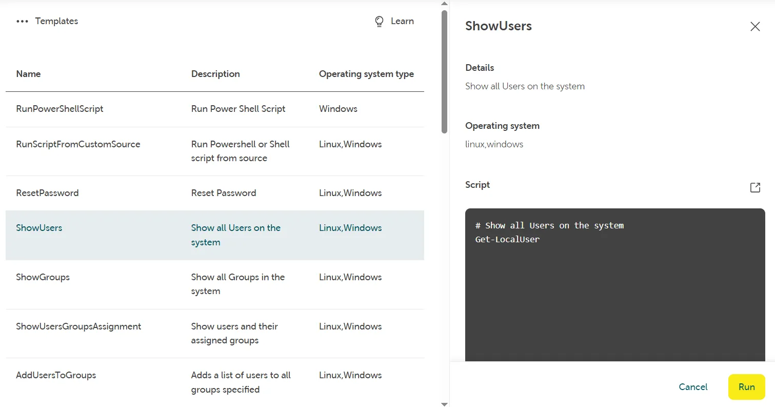 Click on a command template (i.e. “ShowUsers”) and it will display an infobox with details about the supported operating system (Linux/Windows) as well as the content of the executed script: