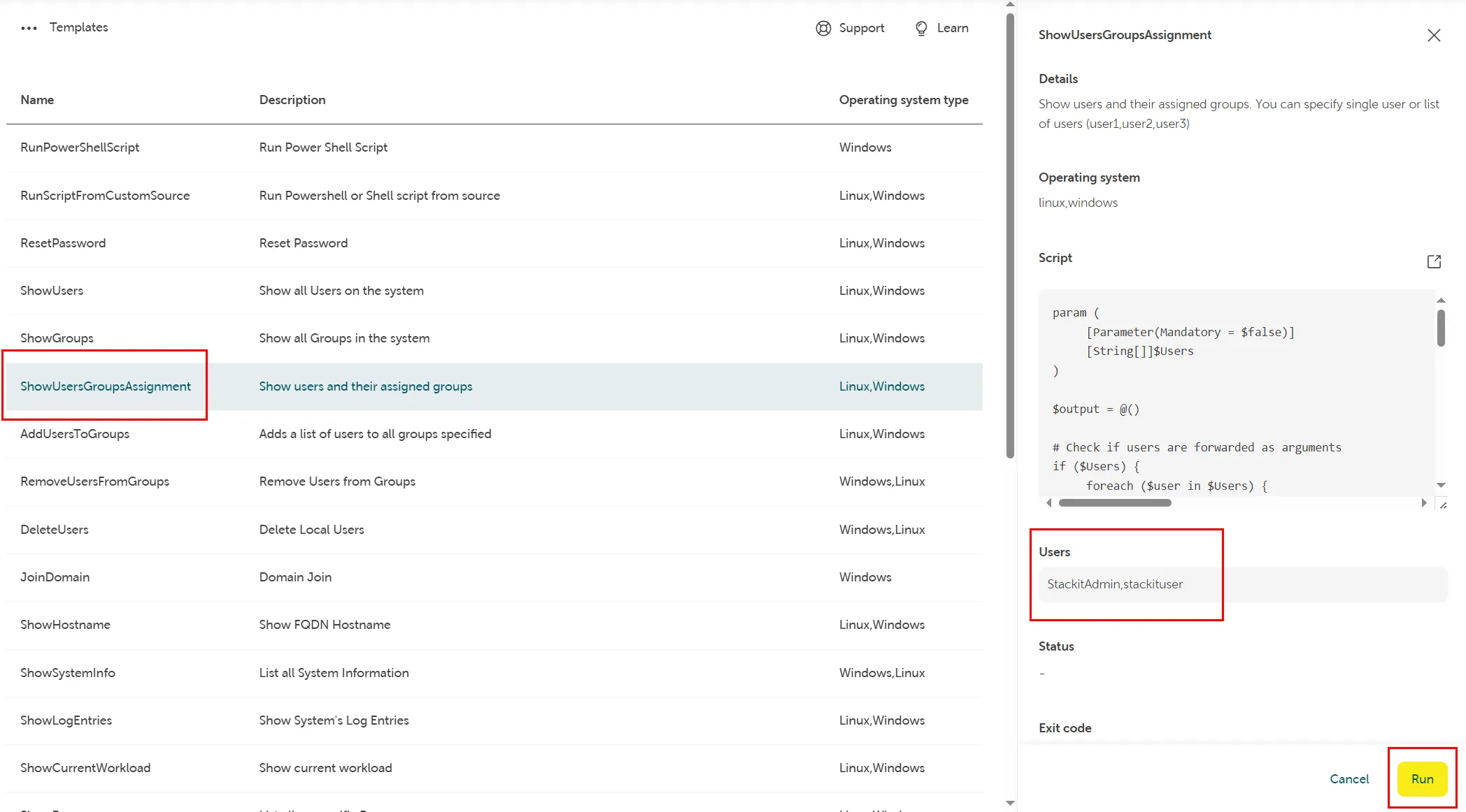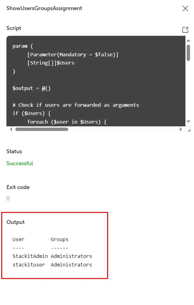 The following example shows the use of multiple arguments (i.e. local users StackitAdmin, stackituser) for the command template ShowUsersGroupsAssignment, which can be used to display all or given users and their corresponding group memberships. In this command template you can place your arguments with comma separation in the argument field.