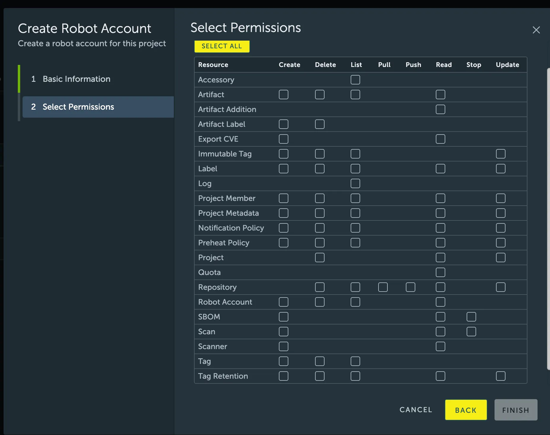 - Assign the specific permissions the robot account needs. For example, a build pipeline typically requires