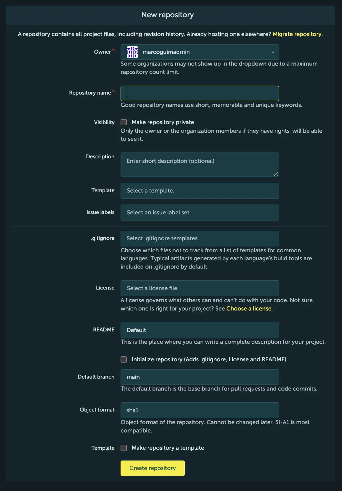 Form field Explanation Owner Here, you can specify whether you want this to be your own personal project or whether you want it to be part of an organization that you’re a part of Repository name A name for your repository (which will also be part of its path) Visibility Repositories are either public or private, where public means that everyone will be able to access your repository, while your private repositories can only be accessed by you and your collaborators Description A short description that appears next to your repository’s name where appropriate Template Occasionally you may want to generate your repository from an existing template. In that case, you can specify that template here. Otherwise, simply leave this field empty. Issue Labels If you want to initialize your project’s issue tracker with a set of labels that you can use to categorize issues, you can choose one here. You don’t have to choose this right away though, as you can choose and modify issue labels at a later time as well. See also: Using Labels. .gitignore A .gitignorefile defines which files Git should not keep track of. This is useful, for example to prevent configuration files or binaries to be tracked in version control. You can choose to add a pre-defined file matching the programming language you use now, or add one manually later. License Here, you can choose from a list of FSF/OSI approved licenses. A LICENSE file will then be added to the repository. README Is the first file one should read when accessing a repository. It’s also the first file displayed when accessing a repository. You can think of it as the “homepage” of your repository. Initialize repository In order to add the LICENSE, README and .gitignorefiles mentioned above to your new repository, make sure you tick this box. Default branch Using this field, you can choose how to name the default branch of your Git repository. We recommend you use the predefined default. Object format Is the repository’s object format. We recommend SHA1 as it’s the most compatible. It cannot be changed later once the repository has been created. For a quick start, specify only Owner and Repository name and use default values or fill the fields later for all other entries. -