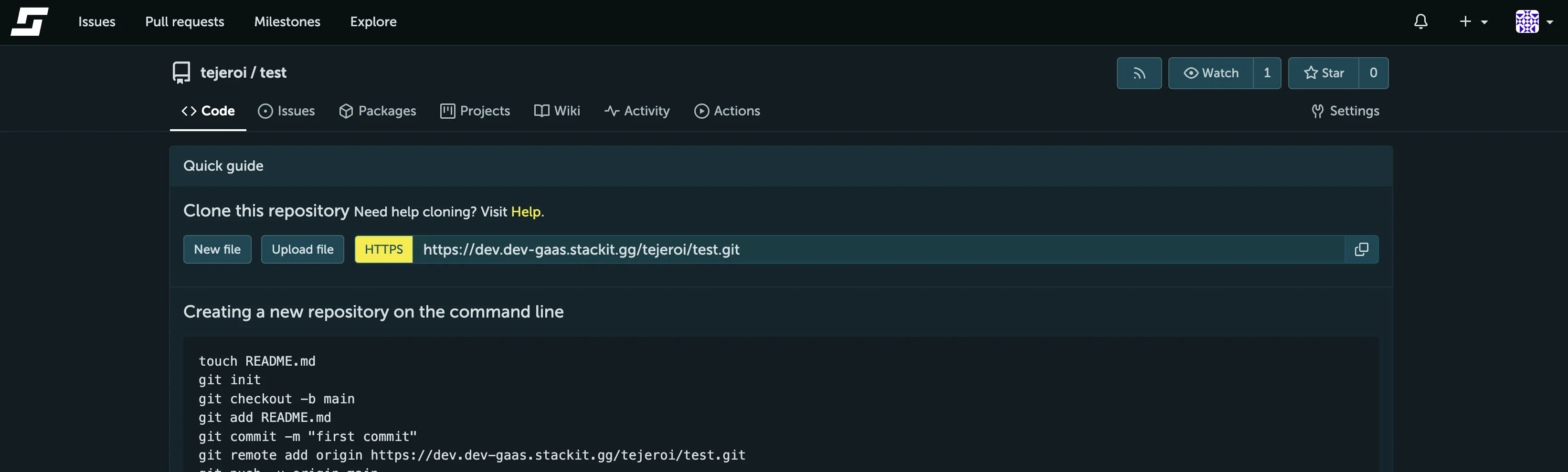Section titled “Option A: Clone the newly created, empty repository”If you want to start a fresh project (that is, if you do not already have source code that you want to upload to STACKIT Git), the quickest way to get started is to clone your newly created repository like this:
