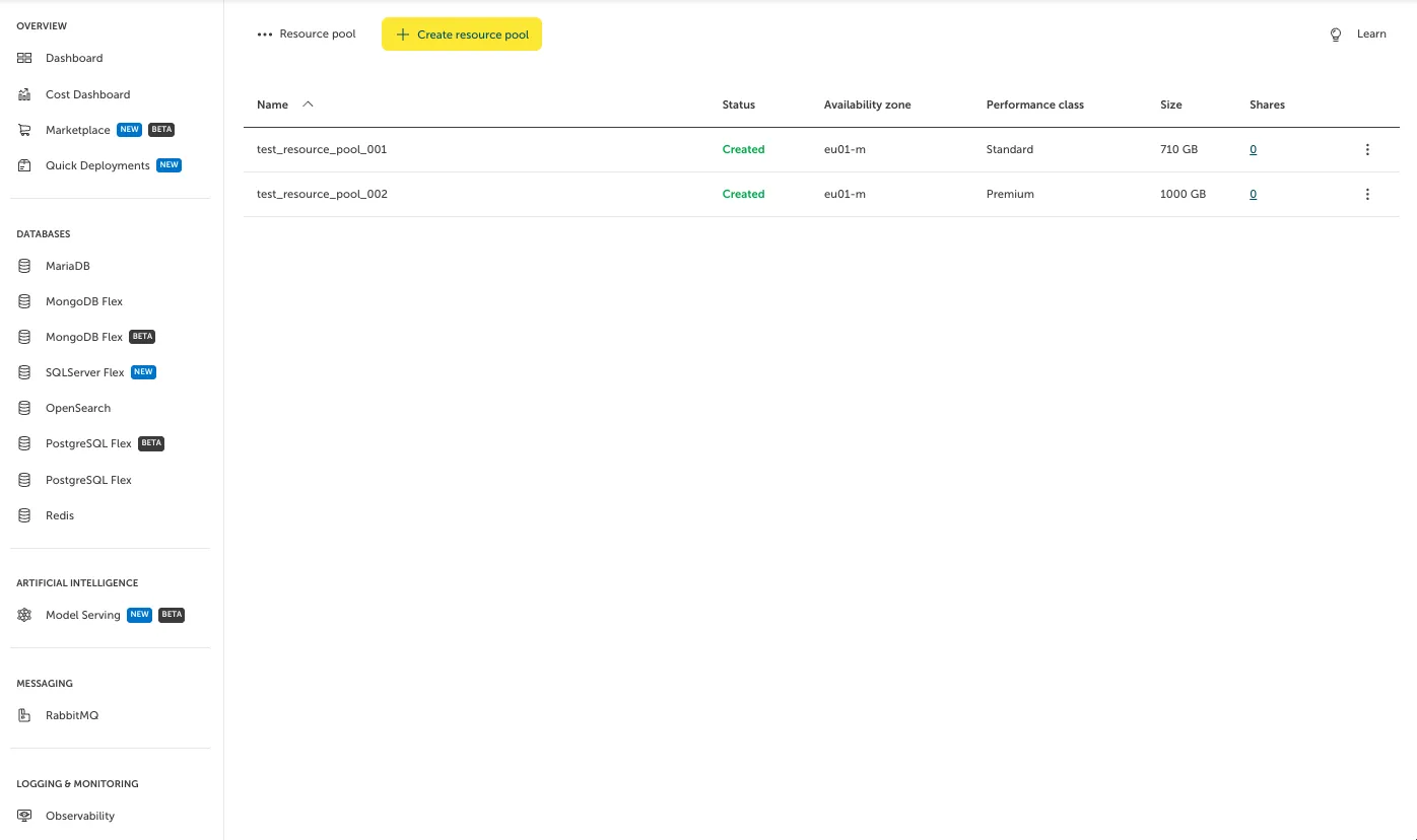 To alter an existing Resource Pool, go to “File Storage > Resource Pools”. Click on the respective Resource Pool in the list, in this case “test_resource_pool_002”.