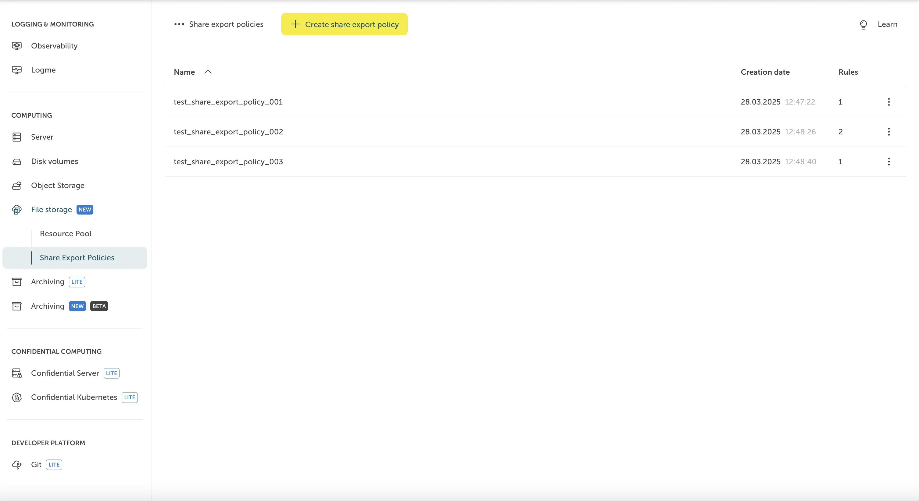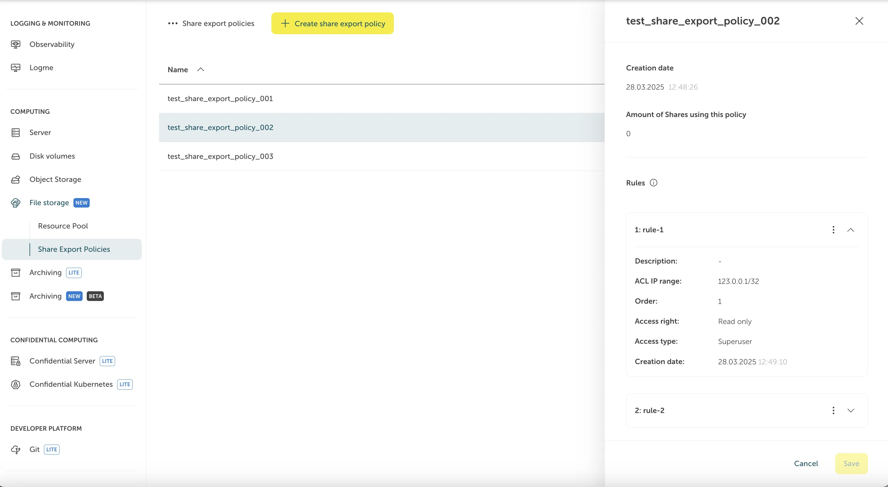 To update a Share Export Policy, go to “File Storage > Share Export Policies” and choose the desired Share Export Policy (in our case test_share_export_policy_002).